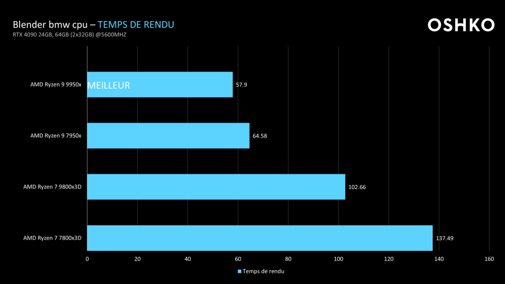 Les modèles 9950X et 7950x, grâce à leur nombre élevé de cœurs et de threads, offrent des performances remarquables pour les tâches de rendu 3D intensives, réduisant significativement les temps de traitement.