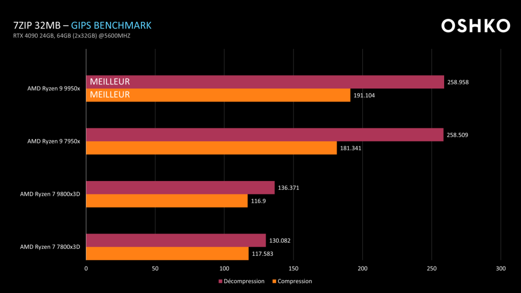 Cette performance s’explique par le nombre accru de cœurs et de threads du 9950X, qui lui permettent de traiter simultanément un volume bien plus important de données compressées.