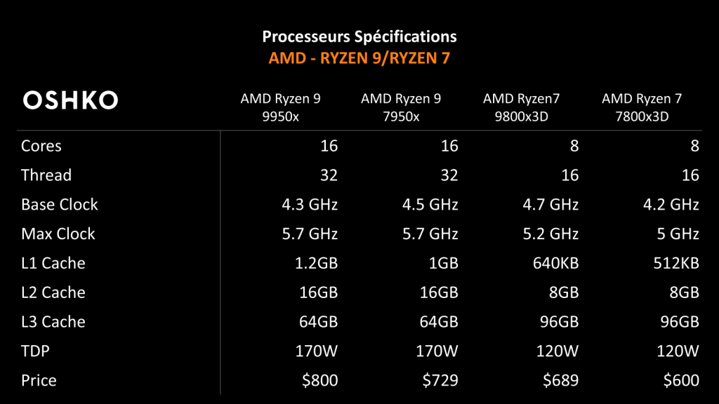 9950X / 7950x : Conçus pour des charges de travail professionnelles intensives, telles que le rendu 3D, le traitement vidéo ou d’autres applications exigeant des performances multicœurs élevées.