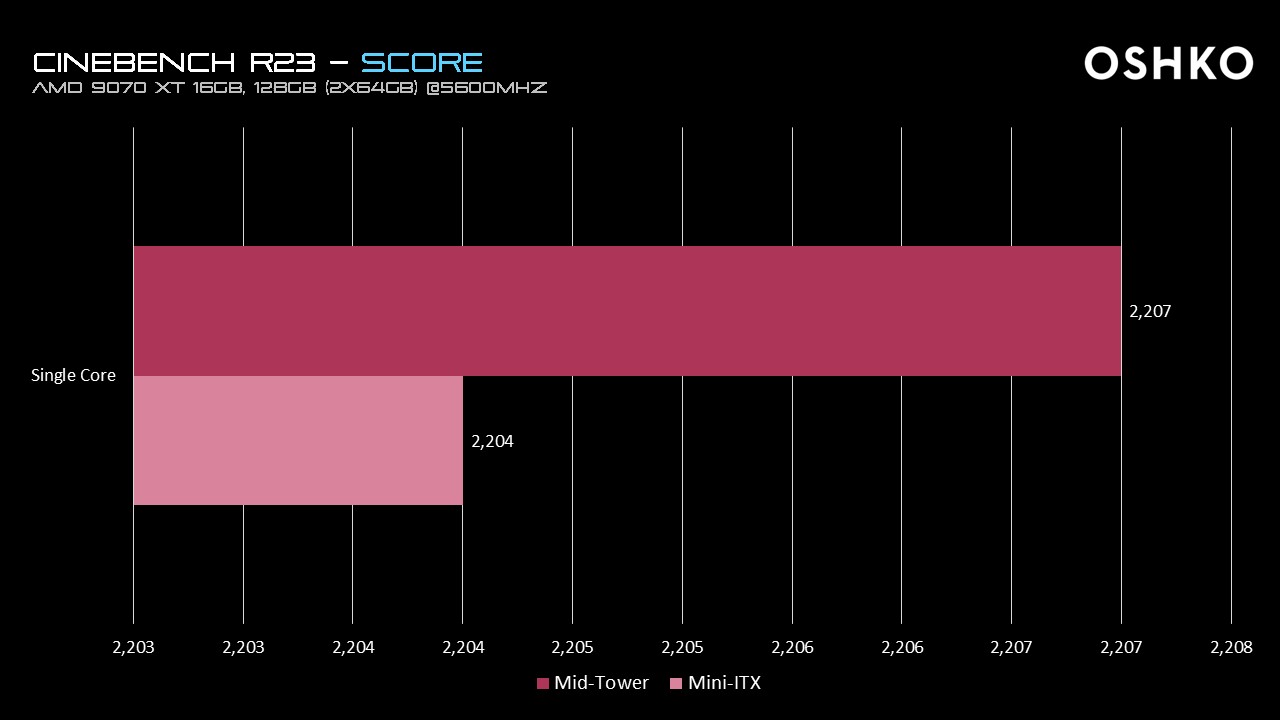 Mono-cœur : le système tour moyenne a obtenu 2 207 points, contre 2 204 points pour le Mini-ITX, soit 0,14 % moins de performance.