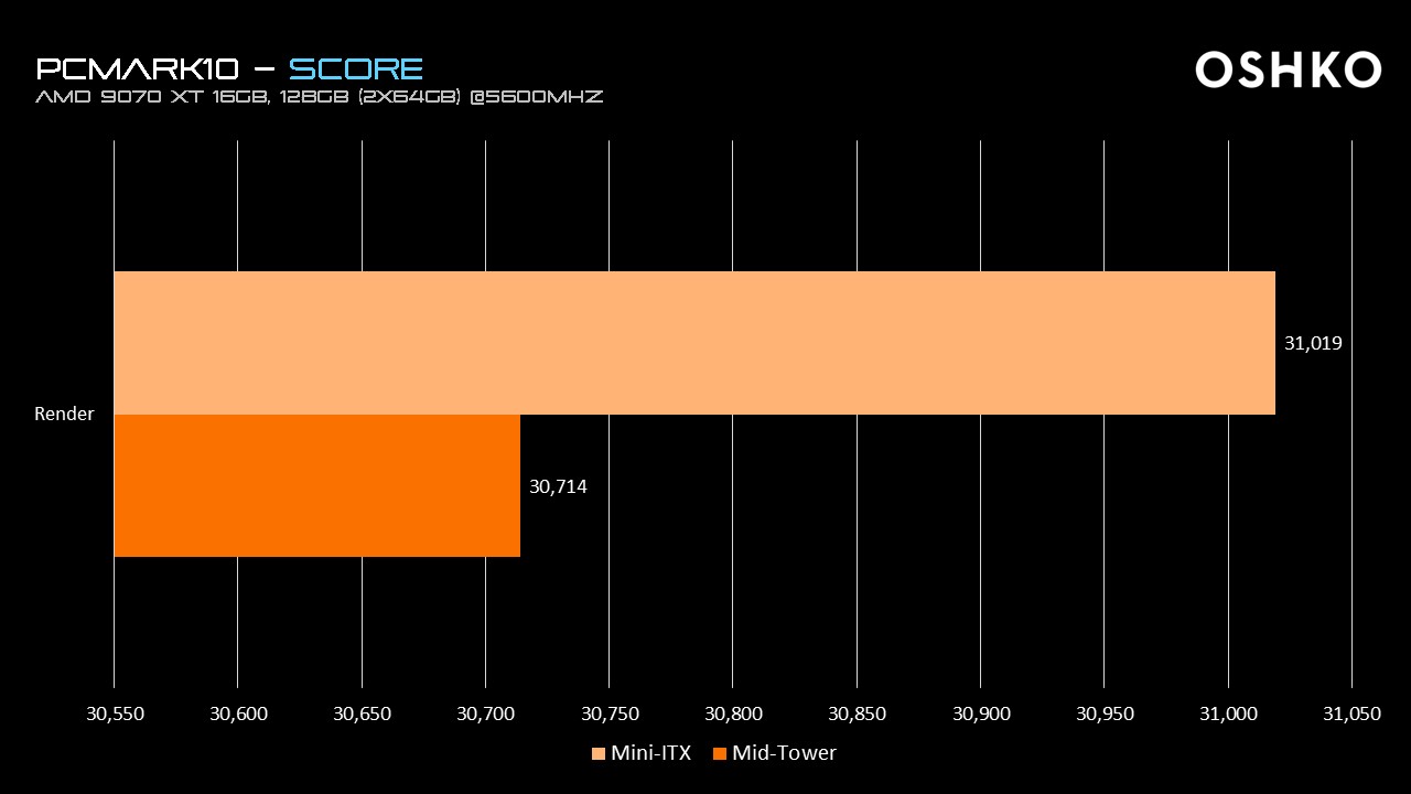 Rendu : le système tour moyenne a obtenu 30 714 points, contre 31 019 points pour le système Mini-ITX, soit une différence de 0,99 %.