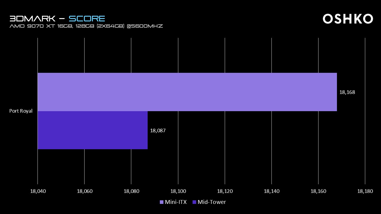 Port Royal : le système tour moyenne a enregistré 18 087 points, tandis que le Mini-ITX a atteint 18 168 points, soit 0,45 % de plus que la tour moyenne.