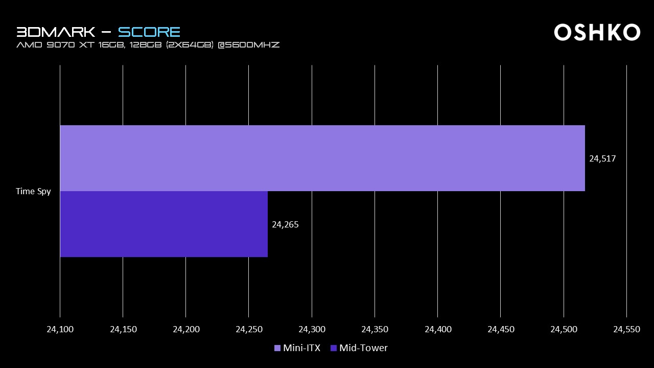 Time Spy : le système tour moyenne a obtenu 24 265 points, contre 24 517 points pour le Mini-ITX, soit une différence de 1,04 %.