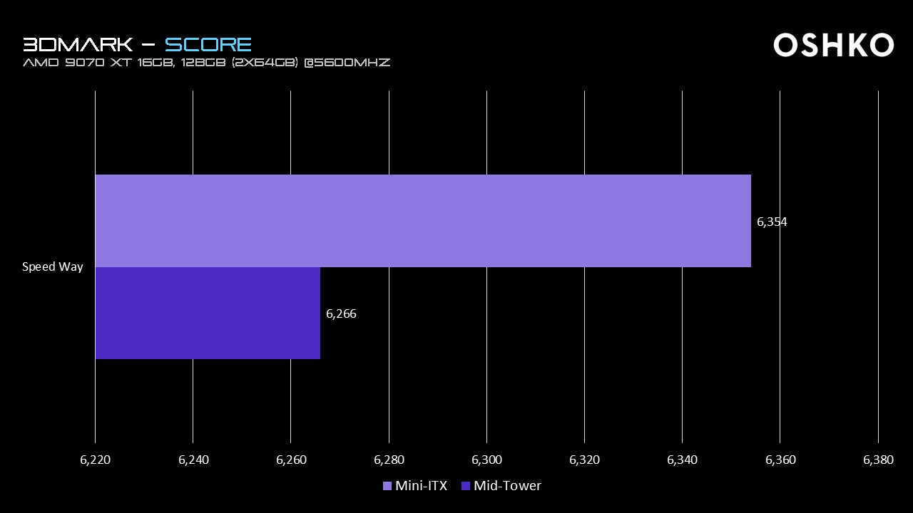 Speed Way : le système tour moyenne a atteint 6 266 points, tandis que le système Mini-ITX a obtenu 6 354 points, soit 1,40 % de plus.