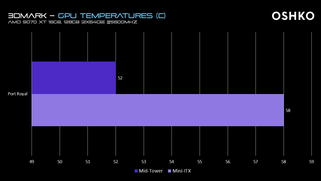 Port Royal : le système tour moyenne a enregistré 52 °C, tandis que le Mini-ITX a atteint 58 °C, soit 11,54 % de plus.