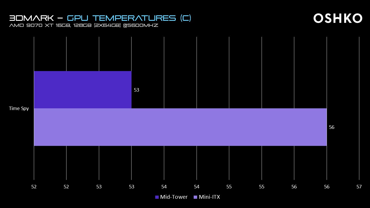 Time Spy : le système tour moyenne a enregistré 53 °C, tandis que le Mini-ITX a affiché 56 °C, soit 5,66 % de plus.