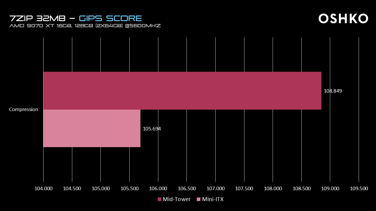 Compression : le système tour moyenne a obtenu 108,849 GIPS, tandis que le Mini-ITX a enregistré 105,694 GIPS, soit 2,90 % de moins.