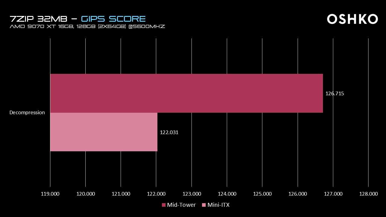 Décompression : le système tour moyenne a atteint 126,715 GIPS, tandis que le Mini-ITX a obtenu 122,031 GIPS, soit 3,70 % de moins.