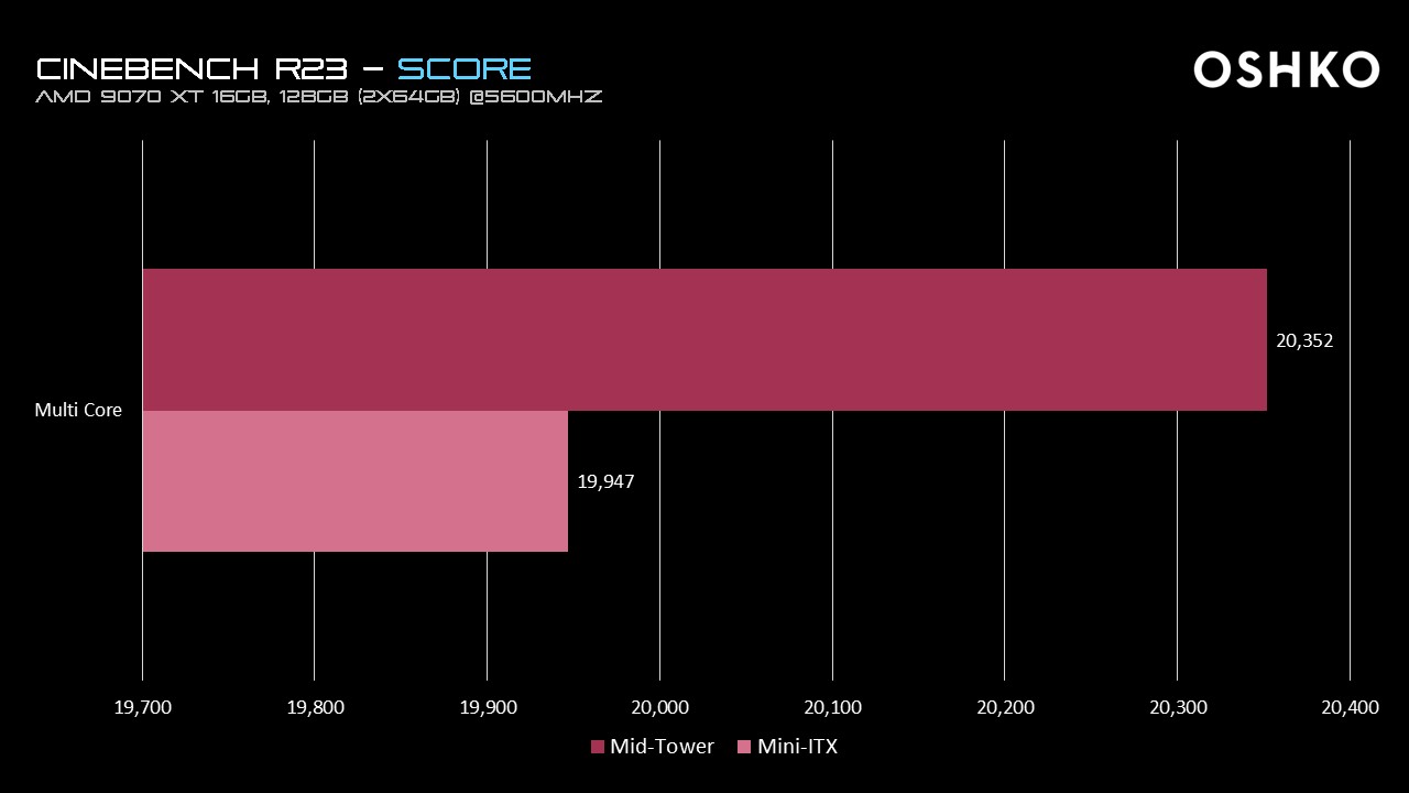 Multi-cœur : le système tour moyenne a atteint 20 352 points, tandis que le système Mini-ITX a obtenu 19 947 points, soit 1,99 % de moins.