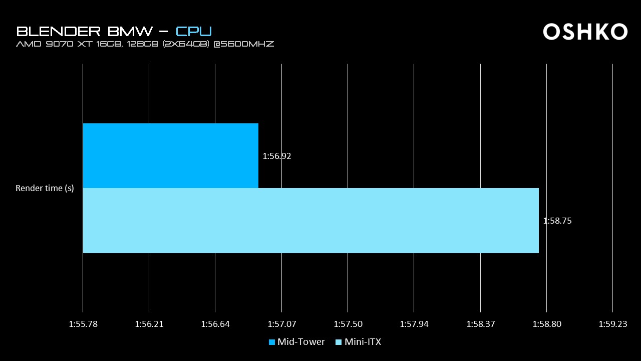 Temps de rendu : le système tour moyenne a terminé le rendu en 1 minute 56,92 secondes, contre 1 minute 58,75 secondes pour le Mini-ITX, soit 1,57 % de plus.