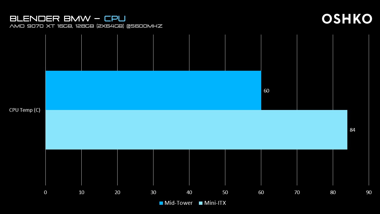 Température CPU : dans la mesure correspondante, le système tour moyenne a atteint 60 °C, contre 84 °C pour le Mini-ITX, soit une hausse de 40 %.