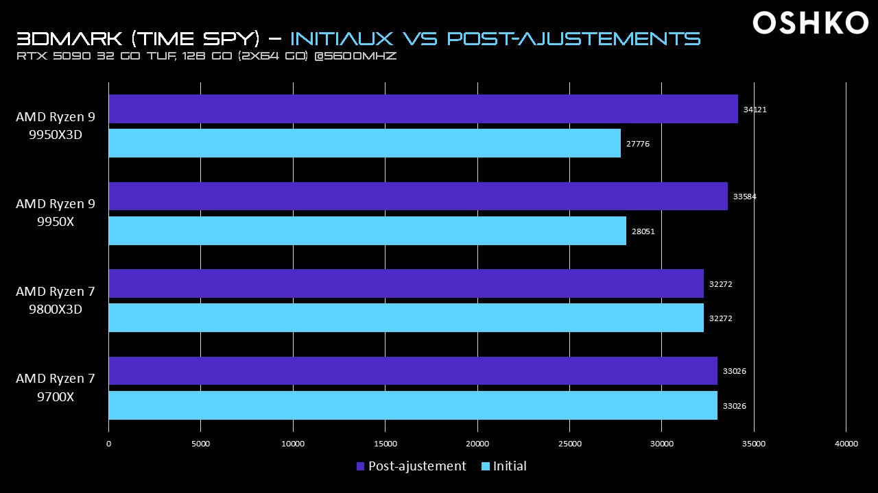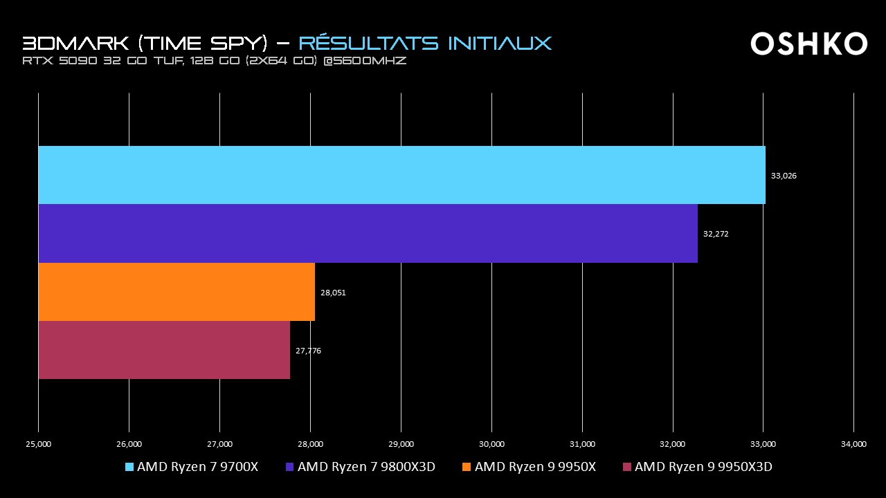 De façon surprenante, et très précisément dans le benchmark 3DMark Time Spy, la réponse semble être oui. Lors de tests approfondis menés dans notre centre de recherche OSHKO LAB, nous avons observé un bottleneck GPU des Ryzen 9 lorsque la carte RTX 5090 était associée aux processeurs AMD 9950X et 9950X3D, dotés d’un grand nombre de cœurs.