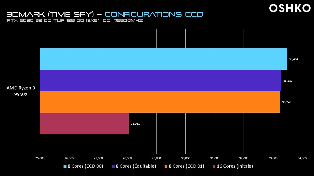 Afin de valider notre hypothèse, nous avons réalisé plusieurs tests en désactivant la moitié des cœurs physiques sur les Ryzen 9 9950X et 9950X3D.