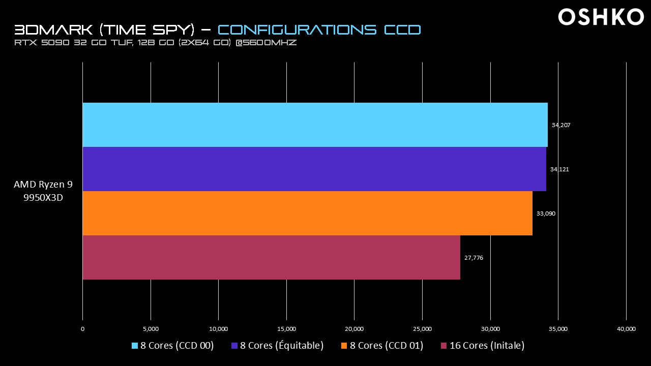 En revanche, ce que ces résultats montrent clairement, c’est que réduire le nombre total de cœurs améliore nettement les performances du benchmark GPU-bound Time Spy. Cela suggère qu’un trop grand nombre de cores actifs peut nuire à la fluidité du pipeline GPU, et que concentrer la charge sur un seul CCD, notamment celui avec la V-Cache dans le cas du 3D, reste une approche pertinente.