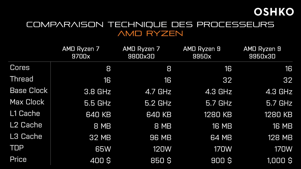 Les quatre processeurs testés partagent une architecture moderne, mais se distinguent nettement en termes de configuration. Pour les caractéristiques complètes, consultez la page des processeurs AMD Ryzen :