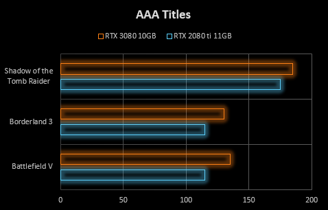 Finally, we have seen an increase in performance for all AAA titles with the RTX 3080 when compared with the RTX 2080 ti. Battlefield V gains 17% in performance, Borderland gains 13% and Shadow of the Tomb Raider gains 6%.