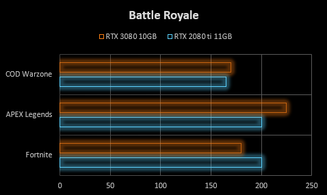 In Battle Royale games, the RTX 3080 outperforms the RTX 2080 ti in two of the three games we tested. While Fortnite loses 10% performance with the RTX 3080, APEX legends gains 13% and COD warzone gains 3%.