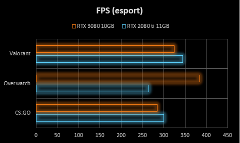 In FPS games, the RTX 3080 outperforms the RTX 2080 ti in one of the three games we tested. We are seeing CS:GO losing 5%, Valorant losing 6%, while Overwatch gaining an incredible 45% increase in performance, hitting the incredible 385 frames per second.