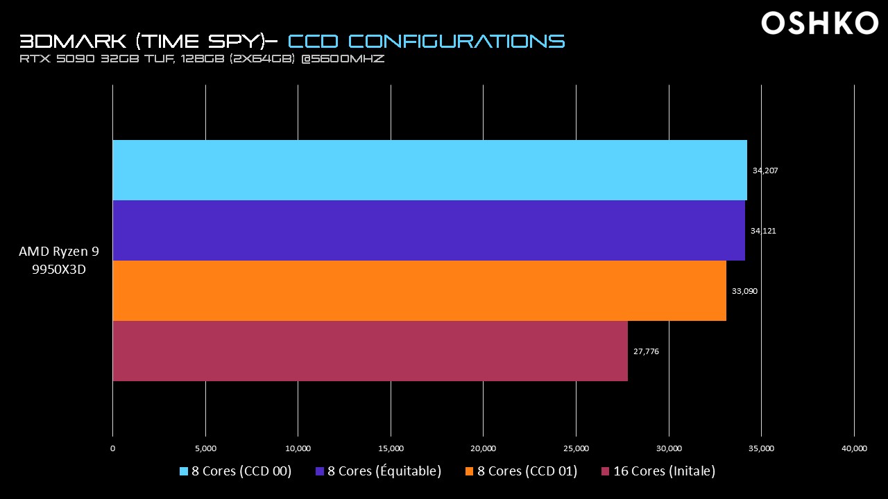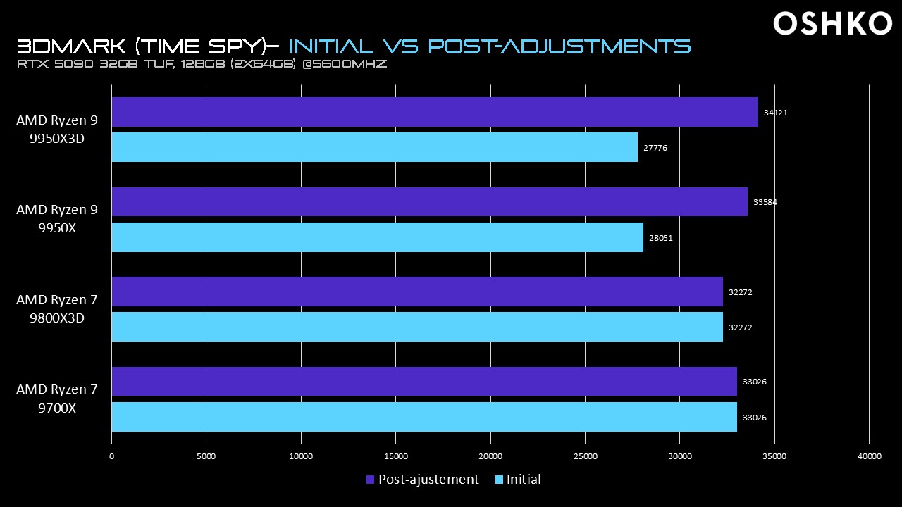 Surprisingly, and very specifically in 3DMark Time Spy, the answer appears to be yes. During extensive tests conducted at our OSHKO LAB research center, we observed a Ryzen 9 GPU performance bottleneck when pairing the RTX 5090 with AMD’s high-core-count 9950X and 9950X3D CPUs.