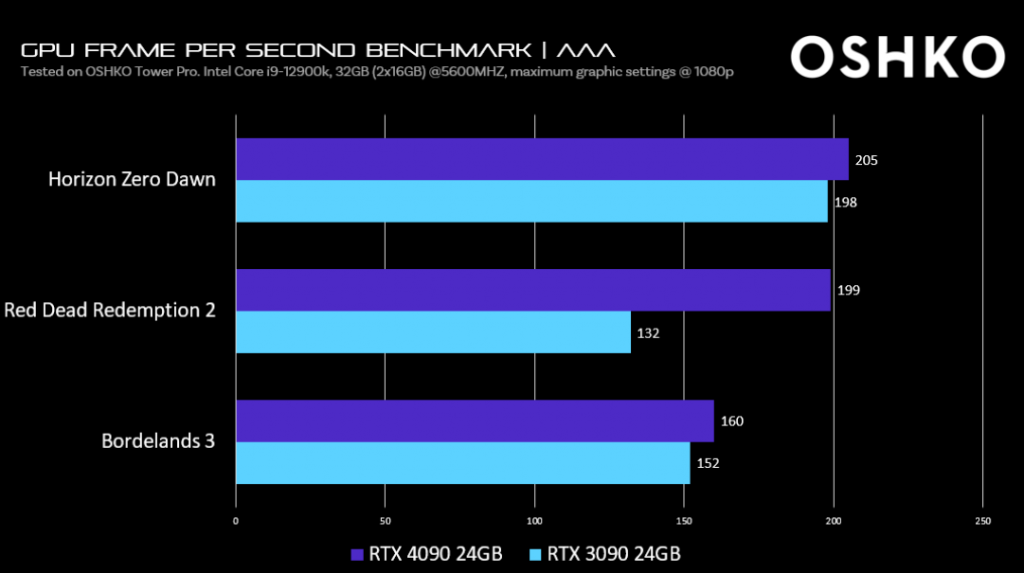For Borderlands 3, the RTX 3090 gives us a nice 152 FPS and the RTX 4090 only shows an additional 8 frames at 160 FPS, which makes for a 5% increase in performance.