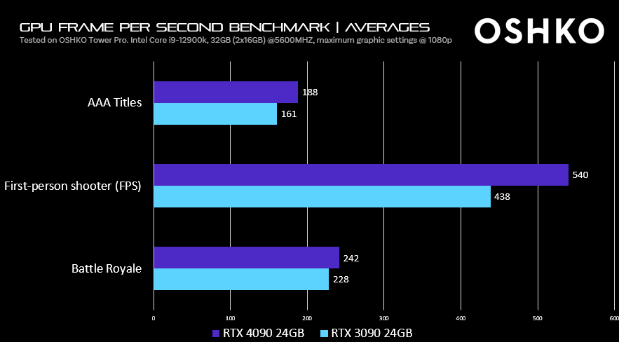 As we can see on the chart below, the lowest frame rates were obtained with AAA titles as those are usually the most GPU intensive games. On average the RTX 3090 managed 161 FPS while the RTX 4090 managed a decent 188 FPS. On average in this category, there’s a 17% improvement between the two GPUs.