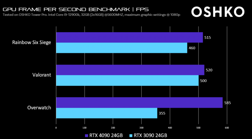For the first-person shooter (FPS) category, the most noticeable difference between the GPUs is on Overwatch. While the RTX 3090 manages 355 FPS, the RTX 4090 blows it out of the park with a whopping 585 FPS. This makes for an incredible 65% improvement between the two GPUs.