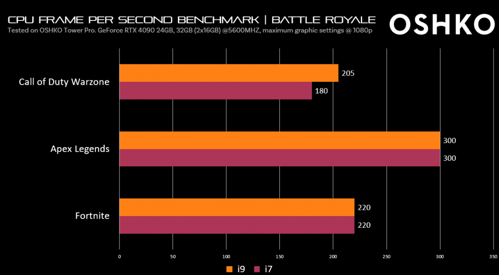 In this category, the i9 allows you to reach at least 500 FPS even with the settings maxed out. The improvement between the CPUs is quite notable and so getting a better processor might be something to consider if you’re playing on a more pro level, although you might not miss out on much with an i7-12700K and a some optimized in-game settings.