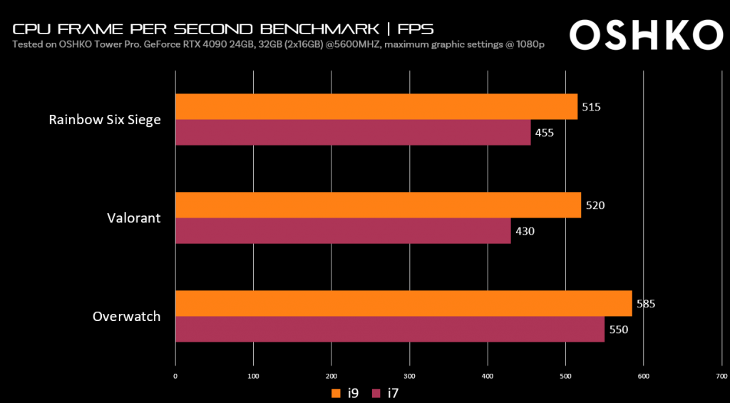 The biggest improvement is on Valorant, with the i7 reaching 430 FPS while the i9 reached 520 FPS, which makes for a 21% improvement.