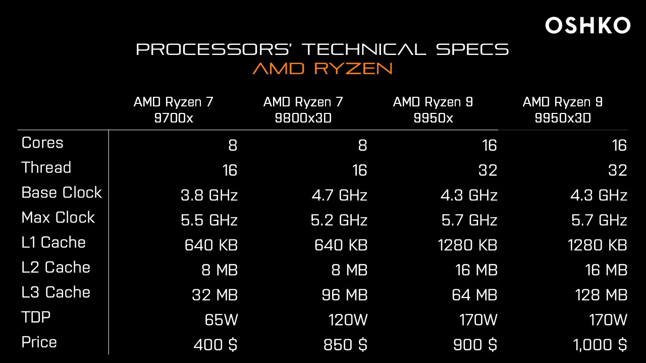 Many creatives and developers wonder whether moving up to a 9950X or 9950X3D is worth it for their workstation. Rather than relying solely on gaming performance, we at OSHKO decided to evaluate these CPUs in real‑world productivity scenarios: 3D rendering, file compression, photo editing and video editing.