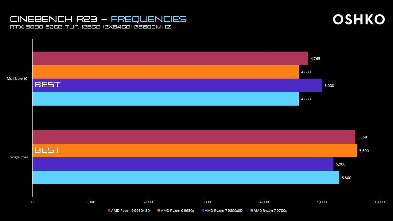 Single‑core: 9950X boosts to 5,600 MHz, +0.6 % over 9950X3D (5,568 MHz), +7.7 % over 9800X3D (5,200 MHz) and +5.7 % over 9700X (5,300 MHz).