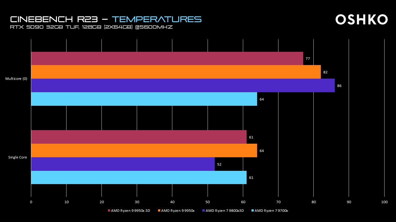 Single‑core: 9800X3D is coolest at 52 °C, well below the others, notably 9950X (64 °C, +23.1 %).