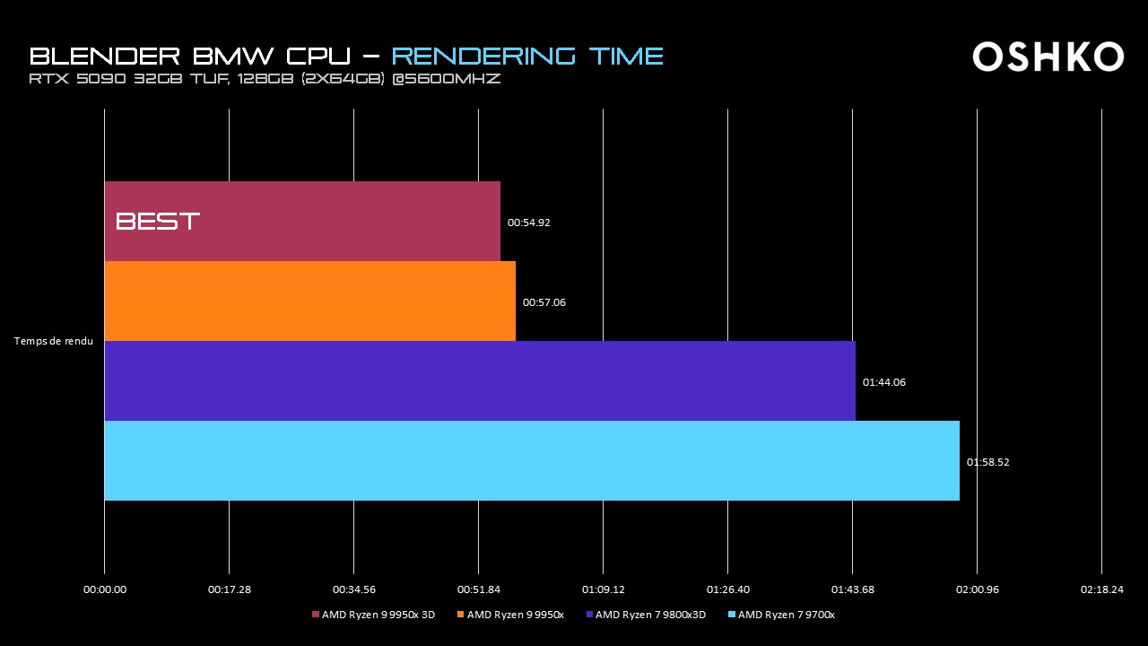 Render time: 9950X3D completes in 54.92 s, -3.8 % versus 9950X (57.06 s). The gap widens against 9800X3D (1:44.06 → 104.06 s, -47.2 %) and 9700X (1:58.52 → 118.52 s, -53.7 %).