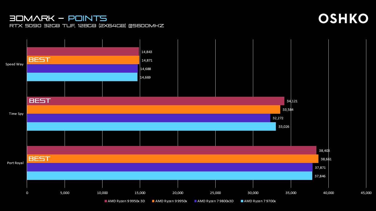 Speed Way: 9950X hits 14,871 pts, +0.2 % over 9950X3D (14,843 pts), +1.3 % over 9800X3D (14,688 pts) and +1.4 % over 9700X (14,669 pts).