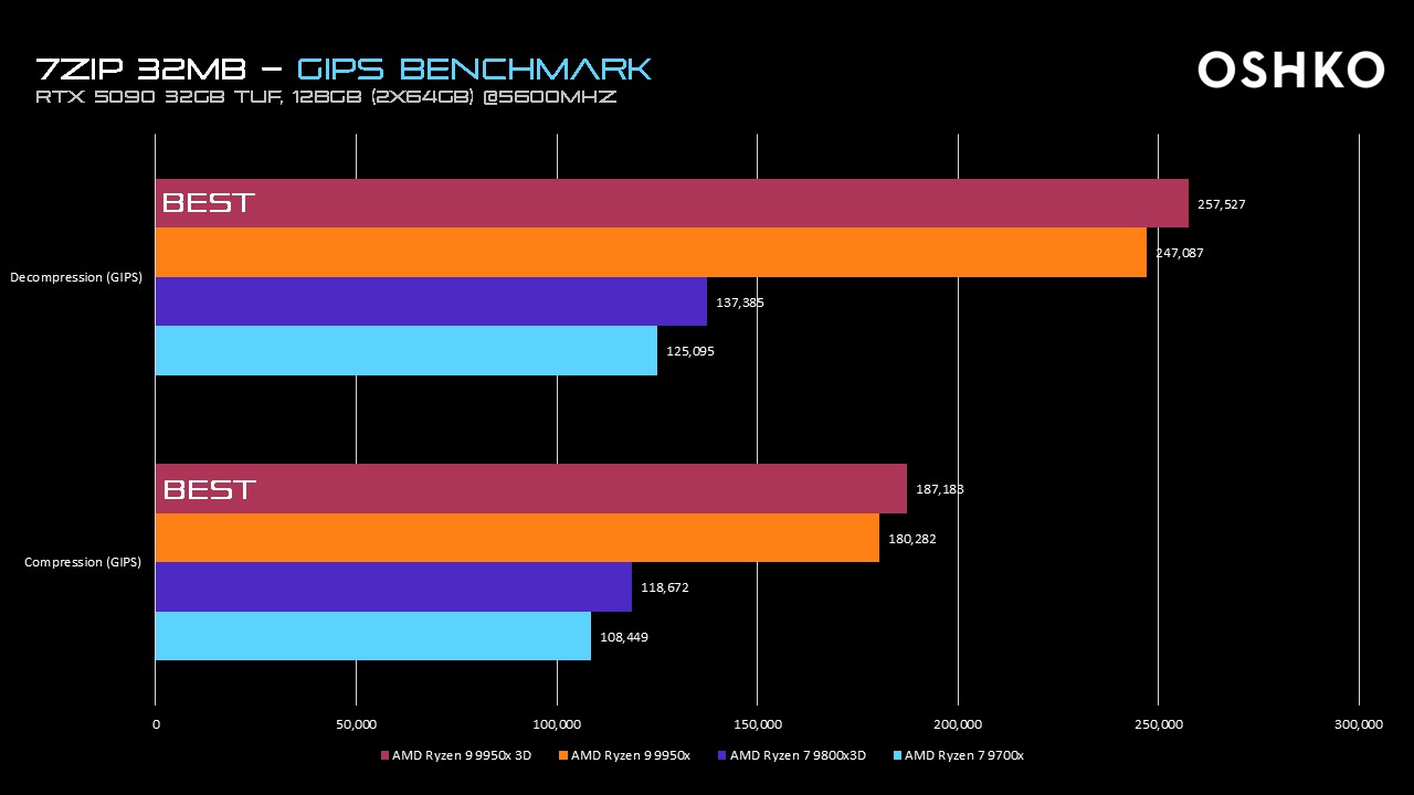 Compression: 9950X3D scores 187,188 GIPS, +3.8 % vs 9950X (180,282 GIPS), +57.8 % vs 9800X3D (118,672 GIPS) and +72.7 % vs 9700X (108,449 GIPS).